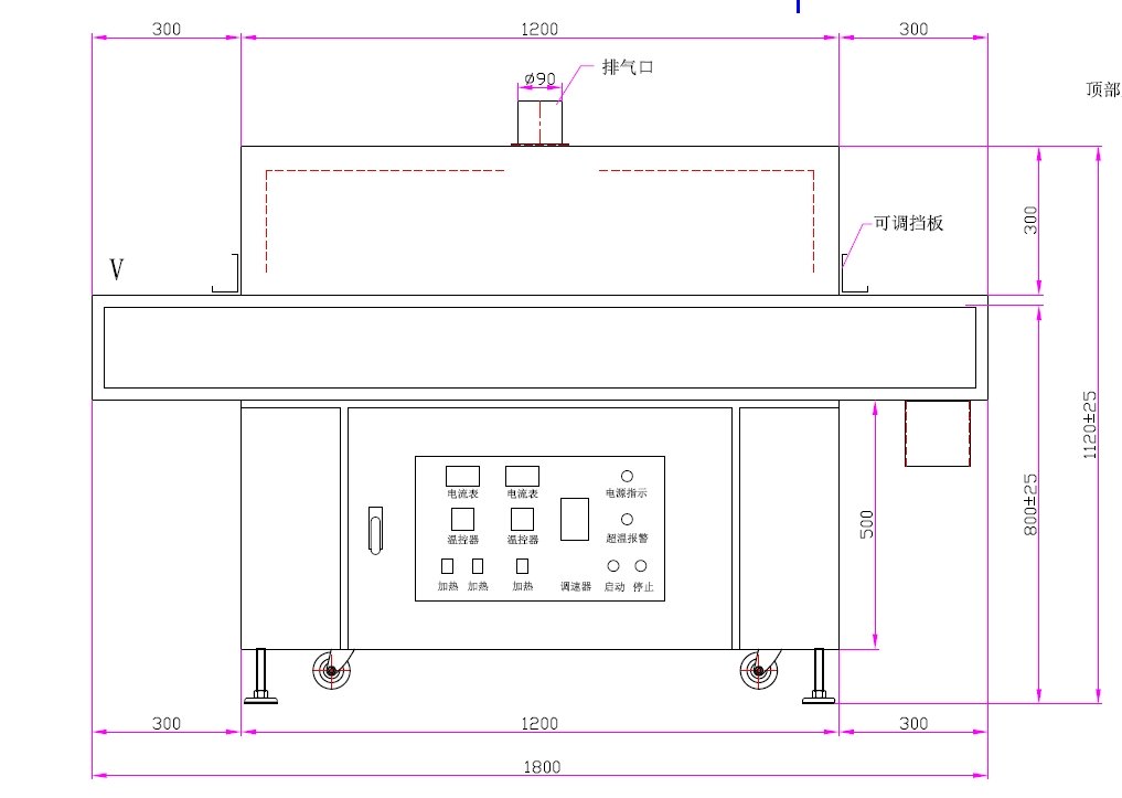 該隧道爐專為圓形鋰電池熱縮管封裝設計,采用半面鍍白中波輻射管(單根700W),發熱管分布于工件兩側、頂部及底部,結合無級調速特氟龍網帶(300mm寬)實現均勻加熱1。設備配備雙溫區控制,加熱溫度達150℃,輸送速度0-3m/min,外殼采用冷軋鋼板噴塑+不銹鋼內膽結構,支持上箱翻蓋維護,超溫自動斷電報警,適配220V電源