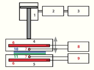 UV固化測試儀包括有已定義的和可再產的測試參數:由壓力持續時間控制器(2)和壓力強度控制器(3)支持的壓力裝置(1),把活動夾板(4)壓在固定夾板(5)上。兩個夾板都裝有加熱部件(6)和作為溫度控制器(8 、9)一部分的溫度傳感器(7)。接觸印相紙(10)和測試樣張(11)被保持在兩個夾板之間