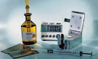 盡管丙酮已經不再能夠溶解所有的可UV固化的耗材,但Fogra的ACET仍然能夠用于上光油或油墨制造商所推薦的溶劑。測試樣張被插入該裝置,并把在用移液管計量的溶劑中浸泡過的毛氈墊放在它的上面。用于把毛氈墊壓在樣張上的力是通過彈簧精確控制的。把裝置的蓋蓋上,并用秒表小心控制接觸持續的時間,在該時段后把樣張取出進行檢查。如果上光油尚未完全固化,就會有一些與下層的油墨一起溶解,紙張就會透背。聚合的程度越高,用溶劑溶解上光油就越困難,而且經常必須用毛氈墊摩擦直到油墨被明顯擦臟時為止。